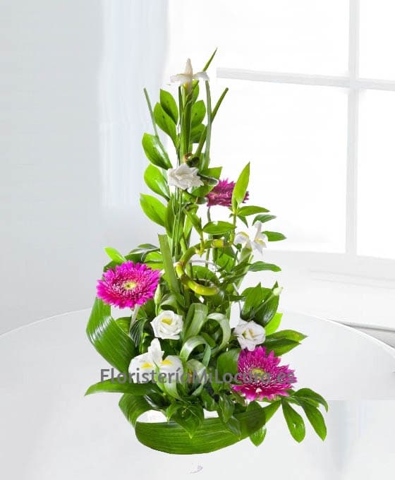 De diseño, aspecto primaveral y especialmente bonito es este Centro Bambú. Es un centro de flores de regalo compuesto por bonitas flores como las gerberas, los iris, los lisianthums, y con el especial toque del bambú, que le da un aspecto totalmente diferente y con un diseño especial, todo ello decorado también con bonitos verdes silvestres. En nuestra Floristería, su floristería online, podemos ayudarle a hacer el regalo perfecto. Haremos llegar a su ser querido, todo el amor y alegría que quiere demostrar con los centros de flores de regalo.