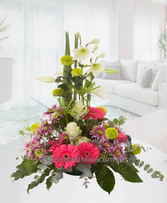 Os presentamos esta composición primaveral, fresca y de aspecto silvestre; el Centro de Flores Túnez. Dicha composición floral, contiene flores variadas, como son el Lilium Longiflorum, las margaritas, gerberas y rosas. Todo ello decorado con bonitos verdes. Exprésale el amor que sientes por tu pareja, familiar o cualquier allegado mediante este alegre Centro de Flores. Si lo que quieres es sorprender a ese ser querido, te recomendamos este alegre centro de flores.