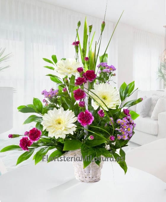 Elegante y bonita Cesta Flor África. Esta cesta de flores de regalo está compuesta por bonitas flores silvestres como las, todas ellas apoyadas en una bonita cesta de mimbre y decorada con bonitos verdes. En nuestra floristería online, expertos en el arte floral, podemos ayudarle a hacer el regalo perfecto. Haremos llegar a su ser querido, todo el amor y alegría que quiere demostrar con este bonita cesta de flores a domicilio. Sin duda, lo que quiere es hacer el mejor regalo.