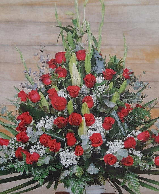Elegante centro Funerario de Rosas de nuestra floristería online en color rojo (Rosas Rojas para el Tanatorio, verdes variados, esponja y cinta funeraria). Si quiere enviar flores al tanatorio, el citado centro para difunto puede variar de color según el gusto del cliente. Es un detalle serio y respetuoso que agradecerá la familia del fallecido. Son Rosas Rojas para el Tanatorio de primera calidad y lleva unos verdes que dan luminosidad al trabajo. Nuestros proveedores de flores para sepelios son nacionales e internacionales.