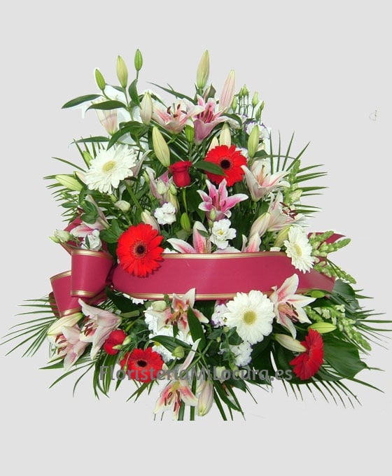 Elegante Centro Piramidal Premium. Está compuesto por una base con liliums, gerberas rojas, rosas, claveles y adornadas con verdes espectaculares (8 liliums, 8 gerberas, 2 rosas, 6 claveles, 4 antirrihinums, verdes variados, esponja y cinta funeraria). Este centro de flores para difunto, está realizado con el mayor cuidado para hacerlo elegante y especial. Es un arreglo floral para momentos muy delicados. Nuestros centros de flores para funeral, están siempre realizados con flores y verdes de primera calidad y nos lo suministran tanto proveedores nacionales, como internacionales. Nuestras flores para funeral están efectuadas de forma artesanal por nosotros. Somos floristas profesionales, expertos en el arte floral funerario, por lo que su centro de flor para difunto quedará bonito y elegante. Si quiere enviar enviar flores al tanatorio nuestras flores para difuntos son la mejor opción.