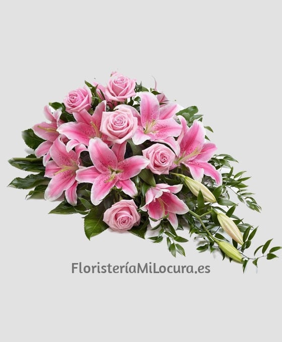Nuestro Palma Funeraria Tonos Rosas, está compuesto por rosas rosas, lilium rosa, verdes variados y esponja. Está diseñado en flor de color rosa. El color se puede cambiar a gusto del cliente y efectuarlo en la tonalidad que mas guste. Es un centro de difunto que tiene un diseño bonito, moderno y original. Este centro de flores para difunto está realizado con flores para sepelio frescas de primera calidad. Si quieres enviar flores al tanatorio, somos floristas expertos en el arte funerario, por lo que, haremos un centro de flores para sepelio muy especial, para satisfacer las necesidades de nuestros clientes.