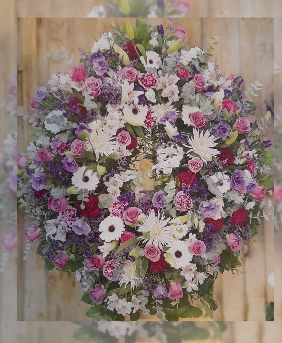 Preciosa Corona Funeraria Variada Lila de nuestra floristería online. Esta Corona funeraria está compuesta por hermosas flores en tonos lilas, todo ello salpicado de bonitos verdes.