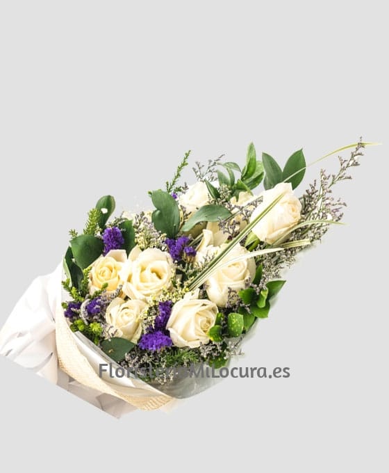 Bonito y fino Ramo Funerario 8 Rosas Blancas para entregar en los Tanatorios. Es un ramo funerario de flores variadas, en tonos blancos, confeccionado con rosas, limoniun azul y verdes variados que le dan al ramo de defunción un toque dulce y delicado. Este ramo de flores para funeral es un producto de gran calidad, con flores para difuntos frescas suministradas a diario por nuestros proveedores, tanto nacionales como internacionales. Por lo que lo elaboraremos lo más parecido posible o a gusto del cliente. Nuestros trabajos de flores para funeral, están siempre realizados con flores para difuntos y verdes variados, Son ramos para funeral efectuados de forma totalmente artesanal por nosotros. Somos floristas profesionales, por lo que su ramo quedará bonito y elegante. Además, ofrecemos un servicio de envíos urgentes de flores para tanatorio.