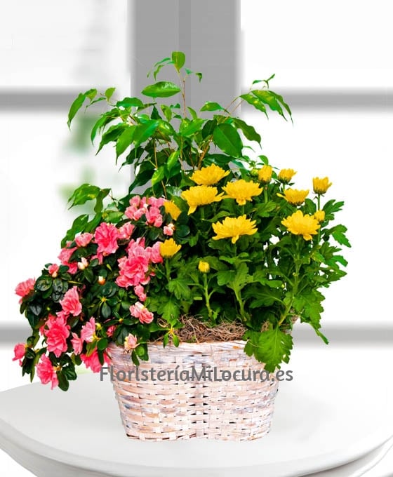 Bonita y Coqueta Cesta Planta Haití, está compuesta por plantas con flor como es la margarita, la azalea, y otras planta verde sin flor. Todo ello apoyado en una cesta de mimbre.