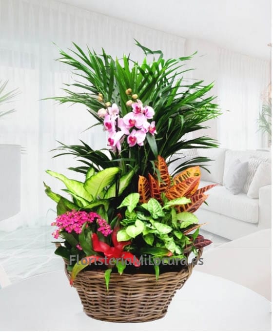 Muy especial y hermosa, os presentamos esta Cesta Plantas Canadá, compuesta por varias de las mejores plantas que se suelen tener en una floristería. Entre ellas destaca la orquídea por su incondicional belleza. Seguro que quieres hacer un regalo perfecto y diferente.