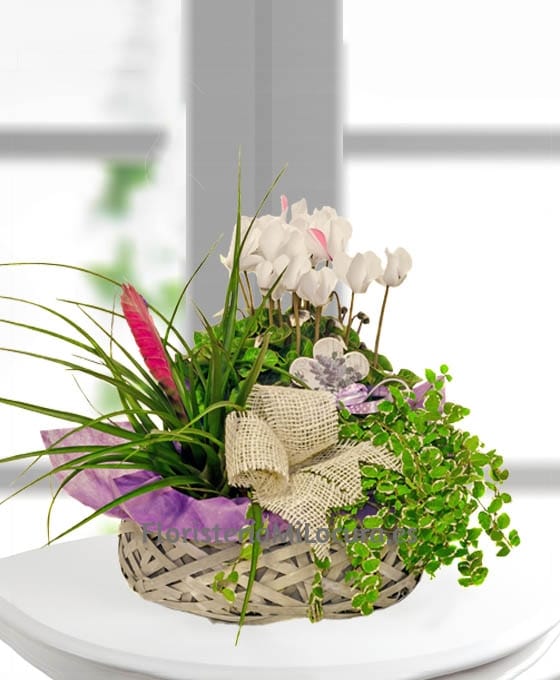 Os presentamos esta Cesta de Plantas Jamaica, compuesta por bonitas plantas con flor como es la briesia, el ciclamen y otra sin flor. Todo ello apoyado en una cesta de mimbre, que le da un toque muy elegante. Es el mejor regalo, para sorprender y homenajear a una persona apreciada y querida.