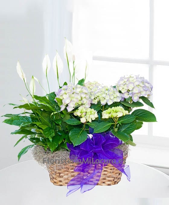 Silvestre, esta Cesta Plantas Toronto se compone por bonitas plantas como es el spahthiphylium y la hortensia. Todo ello apoyado en una cesta de mimbre. Es el mejor regalo, para sorprender y homenajear a una persona apreciada y querida.