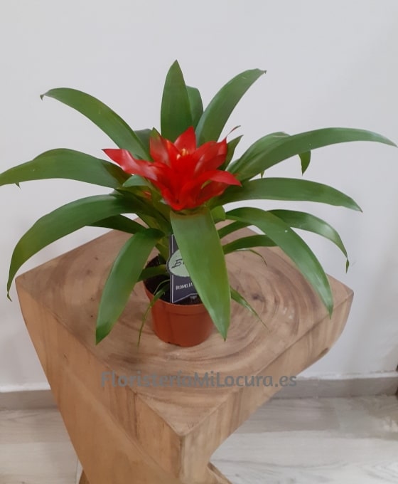 Bonita para cualquier estancia, esta Planta Guzmania es originaria de los bosques húmedos de la India y de Sudamérica. Las hojas son verdes y se disponen en roseta. En el punto de inserción de las hojas se forma el característico depósito de agua que la mayoría de las bromeliáceas poseen.