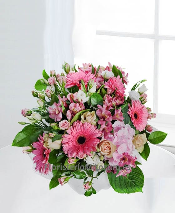 El Bouquet Flores Roma, de entre nuestros arreglos florales, es especialmente bonito, silvestre y romántico en variados en tonos rosados, decorado con bonitos verdes que le dan un aire campestre muy especial. Compuesto por flores muy silvestres como las gerberas, rosas de pitiminí, hortensias, alstroemerias, lisianthums, rosas que le dan un aire alegre y muy bonito. El Bouquet Flores Roma es el regalo perfecto, que sin duda podemos hacer si lo que queremos es alegrar el día a una persona querida. Un poco de la madre naturaleza trasladado a un bonito ramo de flores silvestre, unas flores de regalo.
