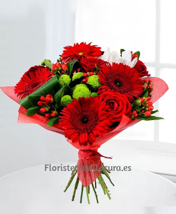 Precioso Ramo Flores Londres, cálido, alegre. Nuestra floristería, presenta esta bonita composición de regalo, exquisita, compuesta de gerberas de color rojo, margarita de botón verde, hierba de oso, aspidistra, rosas rojas. Un Bouquet de flores precioso que podemos enviar al domicilio que se nos indique, para hacer el mejor ramo de flores rojas para regalar.