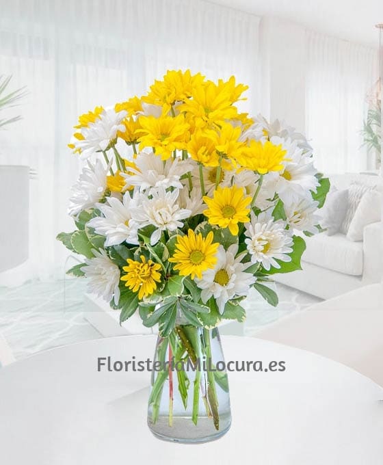 Alegre, bonito y fresco Ramo Flores Oslo en tonos amarillos y blancos. Si queremos alegrar el día a una persona, sin duda, es el regalo perfecto. Es un detalle bonito y especial que presenta nuestra Floristería Online. Un poco de nuestra naturaleza trasladado a un bonito ramo de flores. En este ramo, predominan las margaritas en tonos amarillos y blancos, todo ello decorado de una manera muy silvestre y primaveral. Nuestros ramos silvestres de regalo están realizados siempre con flores para regalar de primera calidad y frescas.